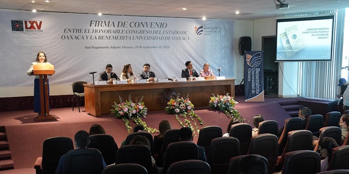 La firma de éste fue presidido por la presidenta de la Jucopo, Laura Estrada Mauro; la presidenta de la Mesa Directiva, Mariana Benítez Tiburcio; la diputada Luisa Cortés García, presidenta de la Comisión Permanente de Estudios Constitucionales; el director de la BUO, David Martínez Pérez; el consejero jurídico del Gobierno de Oaxaca, José Octavio Tinajero Zenil; y el magistrado del Tribunal Superior de Justicia del Estado, Moisés Molina Reyes.
