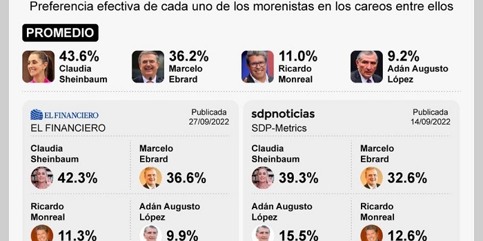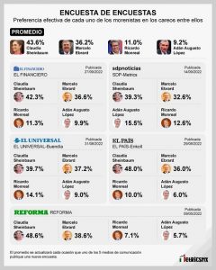 -En “la encuesta de encuestas”, que compara las encuestas más serias de México, Claudia Sheinbaum se coloca como la mejor posicionada de cara a las elecciones 2024. -Claudia Sheinbaum, Marcelo Ebrard, Ricardo Monreal y Adán Augusto López, aspirantes a la candidatura de Morena a las elecciones 2024