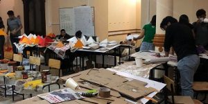También se elaboraron lápidas de cartón colocadas en el patio central. Toda la obra fue elaborada con material reciclado.