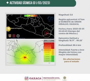 Oaxaca de Juárez, Oax. 02 de marzo de 2023.- La Coordinación Estatal de Protección Civil y Gestión de Riesgos de Oaxaca informó que tras el monitoreo realizado en las regiones del estado, no se reportaron afectaciones derivadas del sismo percibido a las 22:40 horas, de magnitud 5.8 y que tuvo epicentro en Unión Hidalgo, Oaxaca.