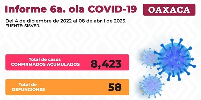 La dependencia precisó que durante la actual sexta ola, de la semana epidemiológica 49, -del 4 de diciembre de 2022-, a la semana 14 de este año, -8 de abril de 2023-, se reportó un global de ocho mil 423 casos positivos acumulados y un total de 58 defunciones.