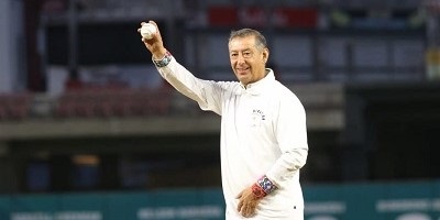 Culiacán, Sin., 26 de abril de 2023.- El director general del Instituto de Seguridad y Servicios Sociales de los Trabajadores del Estado (Issste), Pedro Zenteno Santaella, desde el centro del diamante del estadio de béisbol de Los Tomateros de Culiacán, lanzó la bola inaugural del Torneo Nacional Beisbolissste 2023.