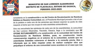 “Una vez escuchada las opiniones de cada uno de los asambleistas, la comunidad de San Lorenzo Albarradas, Tlacolula, Oaxaca, llega a la conclusión que se opone rotundamente a la construcción en la comunidad del Centro de Revalorización de Residuos Sólidos.
