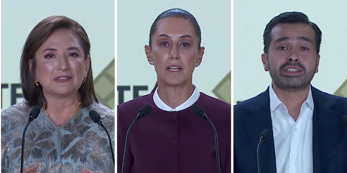Tras agotar su tiempo, Sheinbaum quedó sin poder usar la palabra, mientras Gálvez y Álvarez Máynez continuaron por varios minutos. La candidata de la oposición aprovechó para señalar que el nearshoring se está yendo porque no hay certeza a los inversionistas.
