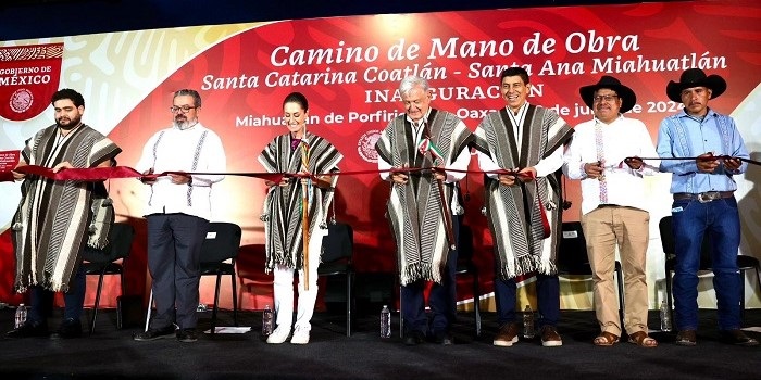 -El Gobernador de Oaxaca, el Presidente Andrés Manuel López Obrador y la virtual Presidenta electa Claudia Sheinbaum Pardo inauguraron la vía que conecta a Santa Catarina Coatlán con Santa Ana Miahuatlán, en la Sierra Sur. -Esta obra tuvo una inversión de 58.1 millones de pesos y corresponde al Programa Nacional de Caminos de Mano de Obra.