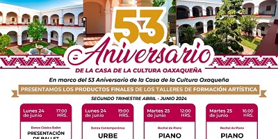 Oaxaca de Juárez, Oax. 22 de junio de 2024.- En el marco del 53 aniversario de la Casa de la Cultura Oaxaqueña (CCO), la institución presentará las acciones que se han realizado en los diversos talleres de formación artística que imparte.
