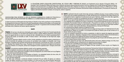 San Raymundo Jalpan, Oax. 9 de agosto de 2024.- La LXV Legislatura local convoca a participar en el proceso de designación de la persona Titular de la Fiscalía Especializada en Materia de Combate a la Corrupción del Estado de Oaxaca.
