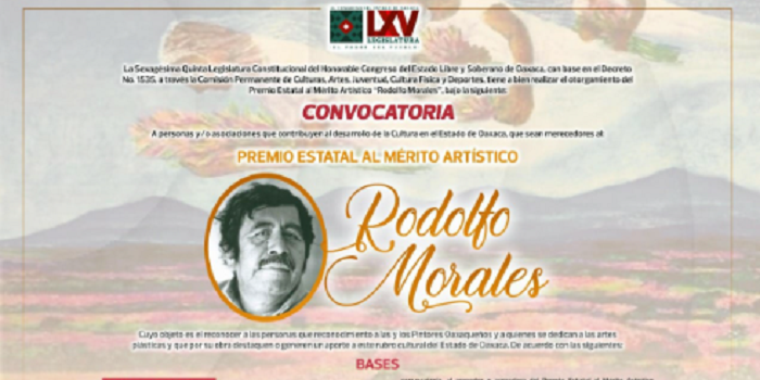 San Raymundo Jalpan, Oax. 13 de agosto de 2024.- El Congreso de Oaxaca convoca a postular a personas o asociaciones que contribuyen al desarrollo de la cultural en el estado, para participar por el premio estatal al mérito artístico “Rodolfo Morales”.
