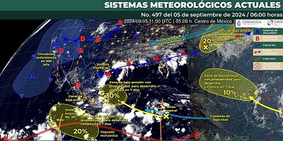De acuerdo con el pronóstico del tiempo emitido por la Comisión Nacional del Agua (Conagua), canales de baja presión situados sobre el centro, sureste y Península de Yucatán, desarrollarán tormentas locales fuertes, asociadas con actividad eléctrica, rachas de viento y chubascos en cortos periodos de tiempo.