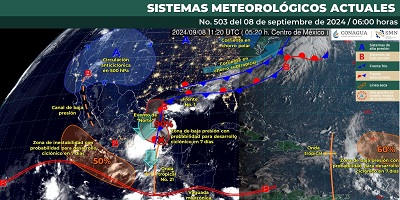 De acuerdo con la Comisión Nacional del Agua (Conagua), el frente frío número 1 se mantendrá frente a la costa de Tamaulipas y Veracruz interactuando con la onda tropical número 21 y una zona de baja presión con potencial para desarrollo ciclónico en el sur del Golfo de México, generando tormentas acompañadas de chubascos, actividad eléctrica, rachas de viento y posible caída de granizo.
