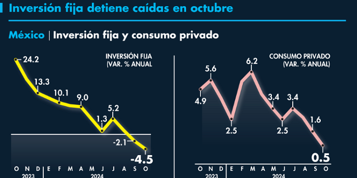“Al inicio del 4T-24, los resultados mostraron pronunciada debilidad del consumo privado y de la inversión fija bruta”, opinaron en un reporte Janneth Quiroz Zamora y Rosa Rubio Kantún, del Grupo Financiero Monex.