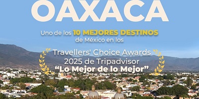 Oaxaca de Juárez, Oax. 19 de enero de 2025.- La Secretaría de Turismo (Sectur Oaxaca) informa que Oaxaca logró ubicarse en el lugar 10 del premio Travellers’ Choice-Lo Mejor de lo Mejor de la comunidad Tripadvisor, por recibir un gran volumen de opiniones y comentarios excepcionales de esa comunidad durante un periodo de 12 meses.