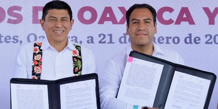 Chahuites, Oax. 21 de enero de 2025.- En el marco de la colaboración interestatal, los Gobernadores de Oaxaca y Chiapas, Salomón Jara Cruz y Eduardo Ramírez Aguilar, respectivamente; firmaron el convenio Marco de Coordinación y Colaboración Intergubernamental de Acciones en Materia de Seguridad, a fin de promover una cultura de paz y bienestar a las comunidades limítrofes de ambas entidades.