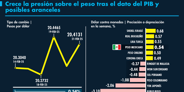 Por: Cristian Téllez | Gráfico EE |El Economista |unes 24 de febrero de 2025 – 12:21. La moneda mexicana se depreció en la semana frente al dólar, con lo que finalizó su buena racha de dos semanas consecutivas con avances, debido al nerviosismo por la aplicación de aranceles y datos macroeconómicos en México que no cumplieron las expectativas del mercado.