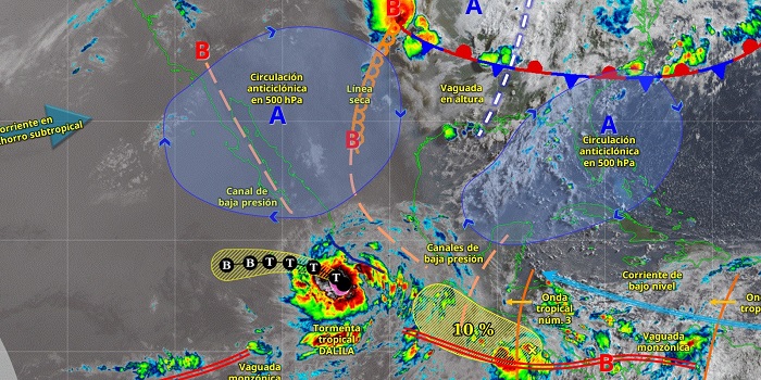 La tormenta tropical Dalila se desplazará frente a las costas de Michoacán y Colima, su circulación y desprendimientos nubosos en combinación con un canal de baja presión sobre el occidente y centro de México, originarán lluvias puntuales intensas en Oaxaca, Guerrero, Michoacán, Colima y Jalisco; puntuales muy fuertes en Nayarit; y chubascos en Sinaloa, todas con descargas eléctricas y con posible caída de granizo.