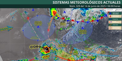 Estos sistemas generarán lluvias moderadas a fuertes en gran parte del estado con algunas localmente intensas en el Istmo de Tehuantepec, Costa y Sierra Sur, asociadas con rachas fuertes de viento, actividad eléctrica y chubascos.