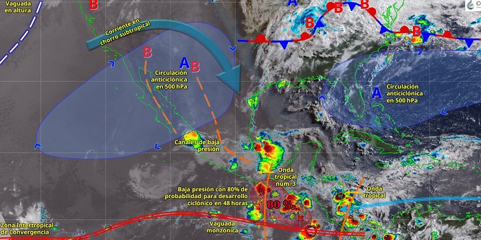SMN/333| Ciudad de México a 16 de Junio del 2025 06:00h. Para hoy, la onda tropical núm. 3, será absorbida por una zona de baja presión con probabilidad para desarrollo ciclónico, lo que originará lluvias puntuales intensas con descargas eléctricas en Oaxaca y Chiapas. A su vez, un canal de baja presión sobre el norte y centro del territorio nacional, en interacción con inestabilidad atmosférica y con la entrada de aire húmedo del golfo de México, generarán lluvias puntuales intensas en el sur de Veracruz; puntuales muy fuertes en Puebla, Estado de México, Guanajuato y Zacatecas; y lluvias puntuales fuertes en Tabasco, Tlaxcala, Morelos, Ciudad de México, Hidalgo, Querétaro, Aguascalientes, San Luis Potosí, Tamaulipas, Nuevo León y Coahuila, todas acompañadas con descargas eléctricas, además de posible caída de granizo en entidades de la Mesa del Norte y Mesa Central, incluido el Valle de México. Asimismo, la entrada de aire húmedo proveniente del mar Caribe ocasionará intervalos de chubascos en Quintana Roo, Yucatán y Campeche. El ingreso de aire húmedo del océano Pacífico producirá lluvias puntuales intensas en Guerrero y Michoacán; puntuales muy fuertes en Colima, Jalisco y Nayarit; puntuales fuertes en Durango y Sinaloa; chubascos en Chihuahua; y lluvias aisladas en zonas de Sonora. Finalmente, se mantendrá ambiente cálido a caluroso por la tarde en la mayor parte del territorio nacional, y ambiente extremadamente caluroso originado por una circulación anticiclónica en niveles medios de la atmósfera sobre el norte y noroeste del país, con temperaturas superiores a 45 °C en zonas de Baja California, Sonora y Chihuahua; además de prevalecer la onda de calor en Baja California Sur (sur), Baja California (norte), Sonora, Chihuahua (oeste, noreste y suroeste), Durango (oeste) y Sinaloa (norte).