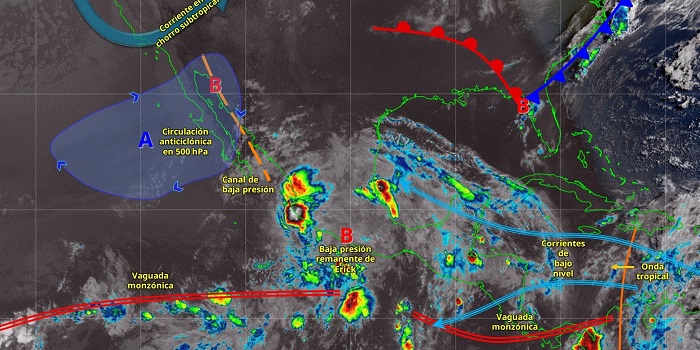 El ingreso de aire húmedo proveniente del golfo de México producirá lluvias puntuales torrenciales en Veracruz, Tamaulipas y San Luis Potosí; puntuales intensas en Puebla e Hidalgo; puntuales muy fuertes en Tlaxcala, Estado de México, Querétaro, Guanajuato y Nuevo León; puntuales fuertes en Tabasco, Ciudad de México, Aguascalientes y Zacatecas; y lluvias con chubascos en Morelos y Coahuila. Por su parte, la entrada de aire húmedo del mar Caribe, generará lluvias puntuales fuertes en Quintana Roo y Campeche; y lluvias con chubascos en Yucatán. Asimismo, el patrón del monzón mexicano que hoy se establece sobre el noroeste de México, propiciará lluvias puntuales intensas en Nayarit, Sinaloa y Durango; puntuales muy fuertes en Chihuahua; y puntuales fuertes en Sonora. Finalmente, una circulación anticiclónica en niveles medios de la atmósfera situada en el noroeste de México mantendrá el ambiente caluroso a muy caluroso sobre entidades del noroeste y norte del territorio nacional, manteniendo durante este día la onda de calor en Chihuahua (noreste, oeste y suroeste) y Durango (oeste y suroeste); así como en zonas de Sonora y Sinaloa. A su vez, se prevé que dicha onda de calor finalice a partir de mañana sábado.