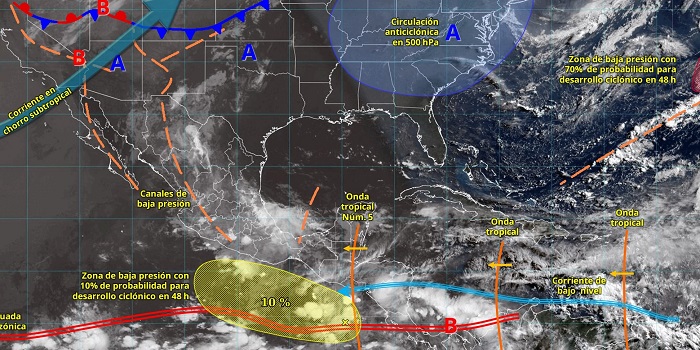 Por otra parte, el patrón de circulación tipo monzón prevalecerá sobre el noroeste de México, generando lluvias fuertes a muy fuertes acompañadas con descargas eléctricas y posibles granizadas en dicha región; con lluvias puntuales intensas en Chihuahua y Durango.