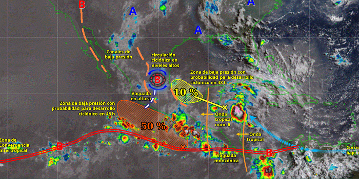 SMN/ 355|Ciudad de México a 27 de Junio del 2025 06:00h. Este día, la onda tropical núm. 6 será absorbida por la zona de baja presión con probabilidad para desarrollo ciclónico del océano Pacífico, la cual se desplazará al sur de las costas de Oaxaca y Chiapas; interaccionará con un canal de baja presión en el sureste mexicano y aunado al ingreso de humedad del océano Pacífico, golfo de México y mar Caribe, así como la aproximación de una onda tropical a la península de Yucatán, generarán lluvias puntuales intensas en Veracruz, Oaxaca, Chiapas, Tabasco, Campeche y Quintana Roo, además de lluvias muy fuertes en Yucatán.
