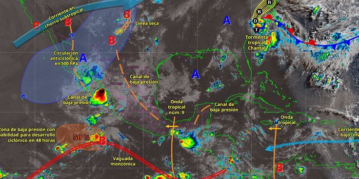 El avance de la onda tropical núm. 9 sobre el sureste y sur del país, generará lluvias puntuales muy fuertes en Chiapas y Oaxaca; y puntuales fuertes en Tabasco y Veracruz. A su vez, la entrada de aire húmedo del mar Caribe en interacción con un canal de baja presión sobre la península de Yucatán, originará lluvias puntuales fuertes en Quintana Roo, Yucatán y Campeche.