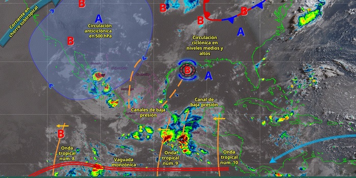Por su parte, la onda tropical núm. 10 que se desplazará sobre la península de Yucatán y el ingreso de humedad del mar Caribe y golfo de México, en interacción con un canal de baja presión en el sureste mexicano, generarán lluvias puntuales muy fuertes en Chiapas y puntuales fuertes en Quintana Roo, Yucatán, Campeche y Tabasco, todas con descargas eléctricas. Finalmente, continuará el ambiente caluroso a muy caluroso por la tarde sobre el noroeste y norte del territorio mexicano, así como en entidades de la península de Yucatán, manteniéndose la onda de calor con temperaturas máximas extremadamente calurosas en Baja California (noreste) y Sonora (noroeste y centro).
