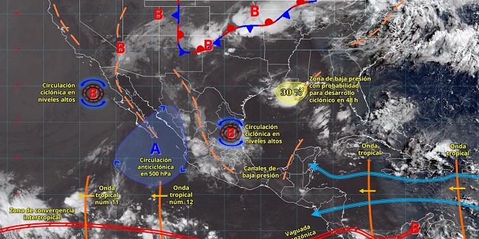 Simultáneamente, el monzón mexicano propiciará lluvias puntuales intensas en Sinaloa y Nayarit, así como lluvias fuertes a puntuales muy fuertes en Chihuahua y Durango; además de chubascos en Baja California y lluvias aisladas en Baja California Sur. Finalmente, prevalecerá el ambiente caluroso a muy caluroso en zonas del noroeste, norte y sureste de la República Mexicana, incluida la península de Yucatán; con temperaturas de 40 a 45 °C en el noreste de Baja California.