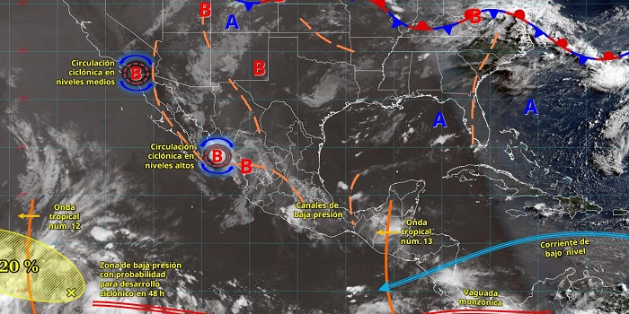 Por otra parte, la onda tropical núm. 13 se desplazará sobre el sureste mexicano y aunado a un canal de baja presión sobre el oriente del país, ocasionarán chubascos y lluvias fuertes a puntuales muy fuertes en las regiones mencionadas, además de la península de Yucatán.