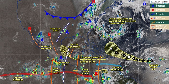 SMN/449| Ciudad de México a 13 de Agosto del 2025 06:00h. Para hoy, el monzón mexicano en interacción con inestabilidad atmosférica, mantendrá la probabilidad de lluvias puntuales muy fuertes en Nayarit, Sinaloa, Durango y Chihuahua; puntuales fuertes en Sonora; intervalos de chubascos en Baja California Sur y lluvias aisladas en zonas de Baja California. Un canal de baja presión prevalecerá sobre la Mesa del Norte y la Mesa Central, en combinación con el ingreso de aire húmedo del golfo de México, ocasionará chubascos y lluvias fuertes a muy fuertes en el norte, noreste, oriente y centro de México. Por otra parte, la onda tropical núm. 21 se desplazará al sur de las costas de Michoacán y el flujo de aire húmedo del océano Pacífico, generarán lluvias puntuales fuertes en Michoacán, Colima y Jalisco. Una vaguada en altura recorrerá el sureste y sur de México y originará lluvias puntuales muy fuertes en Veracruz, Oaxaca, Puebla y Guerrero. Asimismo, una zona de baja presión con probabilidad para desarrollo ciclónico asociada a la onda tropical núm. 22 propiciará lluvias puntuales intensas en Campeche; y puntuales muy fuertes en Quintana Roo, Yucatán, Tabasco y Chiapas. Finalmente, continuará el ambiente cálido a caluroso por la tarde en la mayor parte de la República Mexicana, y muy caluroso en zonas del sur de la península de Baja California, noroeste del país y estados fronterizos del norte de México, llegando a ser extremadamente caluroso con temperaturas máximas superiores a los 45 °C en el noreste de Baja California, noroeste y oeste de Sonora.