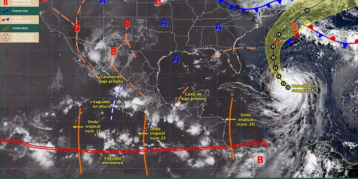 Asimismo, otro canal de baja presión y la aproximación de una nueva onda tropical (núm. 24), generarán lluvias fuertes a muy fuertes en el sur y sureste mexicano, así como en la península de Yucatán; con lluvias puntuales intensas en Chiapas (sur).
