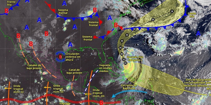 Se prevén lluvias puntuales intensas en Chiapas y puntuales fuertes en Campeche y Tabasco, debido a un canal de baja presión y la entrada de aire húmedo del mar Caribe en el sureste mexicano. La onda tropical núm. 23 frente a las costas de Michoacán, se desplazará hacia el oeste y ocasionará lluvias puntuales muy fuertes en Michoacán y puntuales fuertes en Jalisco y Colima.
