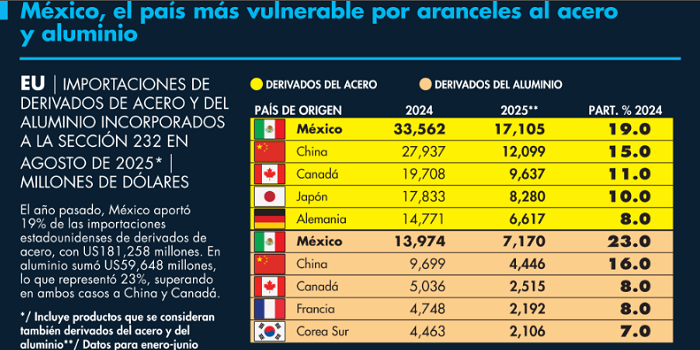 A su vez, de todas las importaciones estadounidenses de derivados de aluminio en 2024, por 59,648 millones de dólares, México aportó 23%, por encima de China (16%) y Canadá (8 por ciento).