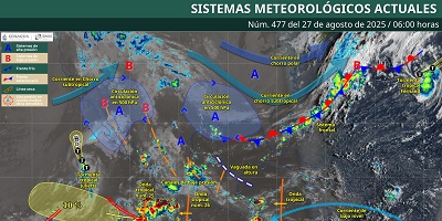 Oaxaca de Juárez, Oax. 27 de agosto de 2025.- La Coordinación Estatal de Protección Civil y Gestión de Riesgos (CEPCyGR) informa que se esperan lluvias de intensidad variable acompañadas de periodos de tormentas fuertes, asociados con aguaceros, rachas de viento y actividad eléctrica, sin descartar la caída de granizo.