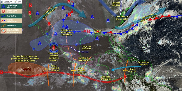 La onda tropical núm. 27 originará lluvias puntuales intensas en Oaxaca y Guerrero; y el aire húmedo del océano Pacífico ocasionarán lluvias puntuales muy fuertes en Michoacán, Colima y Jalisco. Un canal de baja presión que se extenderá desde el norte hasta el centro de México,