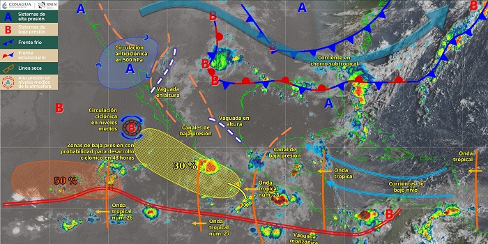 SMN/483| Ciudad de México a 30 de Agosto del 2025 06:00h. Este día, el monzón mexicano, una vaguada en niveles medios de la atmósfera sobre el noroeste del país e inestabilidad atmosférica, propiciarán chubascos y lluvias fuertes a muy fuertes en Baja California, Baja California Sur, Sonora, Chihuahua, Durango, Sinaloa y Nayarit. Por otra parte, un canal de baja presión sobre el interior de la República Mexicana, en combinación con una vaguada en altura y con el desplazamiento de la onda tropical núm. 27 sobre el occidente del territorio nacional, originarán chubascos y lluvias fuertes a muy fuertes en dicha región, además del noreste, centro, sur y oriente de México; con lluvias puntuales intensas en Guerrero. Simultáneamente, la onda tropical núm. 28 asociada con una zona de baja presión con probabilidad para desarrollo ciclónico, en interacción con otro canal de baja presión en el sureste mexicano; originarán lluvias fuertes a muy fuertes en la región mencionada y la península de Yucatán, con lluvias puntuales intensas en Oaxaca y Chiapas.
