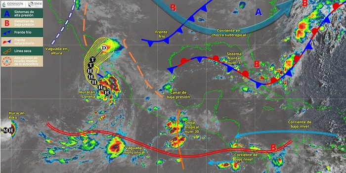SMN/491|Ciudad de México a 03 de Septiembre del 2025 06:00h. Este día, la circulación y desprendimientos nubosos del huracán Lorena, en combinación con el monzón mexicano y una vaguada en altura, ocasionarán lluvias muy fuertes a puntuales intensas acompañadas con descargas eléctricas en el noroeste y occidente del país; además de rachas de viento fuertes a intensas y oleaje elevado en el golfo de California y las costas de Baja California, Baja California Sur, Sonora, Sinaloa y Nayarit. A su vez, el sistema frontal núm. 1 se extenderá como estacionario sobre el noreste de México, generando rachas de viento de 40 a 60 km/h en dicha región, además de chubascos y lluvias fuertes en Coahuila, Nuevo León y Tamaulipas.