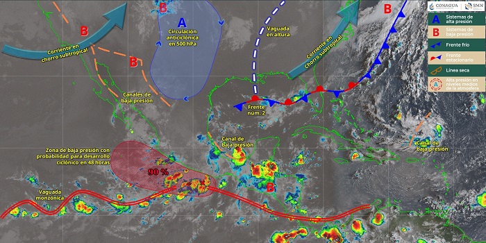 Por otra parte, canales de baja presión al interior del país, inestabilidad atmosférica y el ingreso de humedad, generarán chubascos con lluvias fuertes a muy fuertes en zonas del noreste, oriente y sureste del país, incluida la península de Yucatán; así como lluvias puntuales intensas en Puebla (sureste), Veracruz (centro y sur), Oaxaca (norte, noreste y suroeste), Chiapas (norte y este), Tabasco, Campeche (norte y suroeste) y Yucatán (oeste).