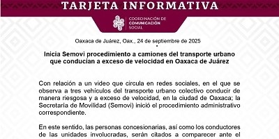 Con relación a un video que circula en redes sociales, en el que se observa a tres vehículos del transporte urbano colectivo conducir de manera riesgosa y a exceso de velocidad, en la ciudad de Oaxaca; la Secretaría de Movilidad (Semovi) inició el procedimiento administrativo correspondiente.