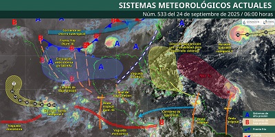 Oaxaca de Juárez, Oax. 24 de septiembre de 2025.- La Coordinación Estatal de Protección Civil y Gestión de Riesgos (CEPCyGR) informa que se esperan lluvias de intensidad variable con tormentas locales fuertes, algunas asociadas con actividad eléctrica en horas de la tarde y con mayor énfasis en zonas montañosas, donde se desarrollarán bancos de niebla matinales, nubes bajas y lloviznas intermitentes.