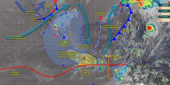 Por otra parte, la onda tropical Núm. 37 se desplazará al sur de las costas de Oaxaca y Guerrero, en interacción con los desprendimientos nubosos de la vaguada monzónica ubicada en el Pacífico Sur Mexicano y con una vaguada en altura extendida sobre la península de Yucatán, ocasionarán chubascos y lluvias fuertes en el sur y sureste del país, incluida dicha península, pronosticándose lluvias puntuales muy fuertes en Chiapas.