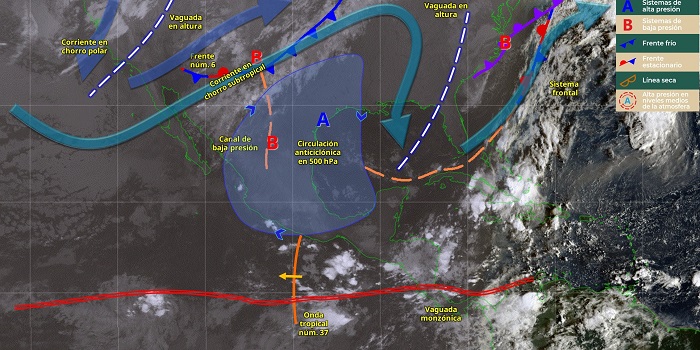 Por otro lado, canales de baja presión sobre el oriente, occidente, sur y sureste del territorio nacional, en combinación con los desprendimientos nubosos de la vaguada monzónica que se extenderá frente a las costas del Pacífico Sur mexicano, la onda tropical núm. 37 sobre Guerrero y otra vaguada en altura sobre la península de Yucatán, propiciarán chubascos y lluvias fuertes en las regiones mencionadas; con lluvias puntuales muy fuertes en Chiapas.