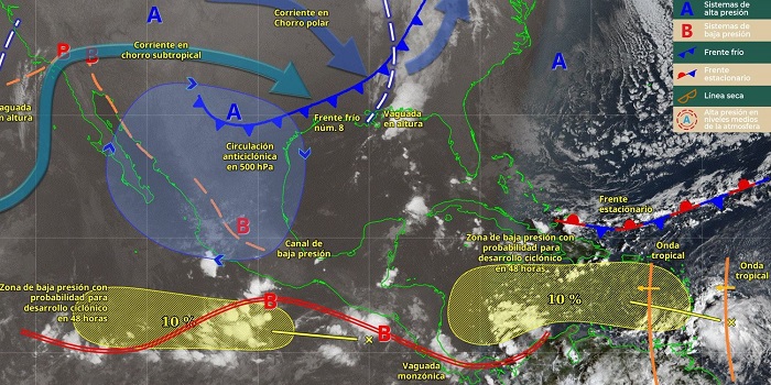Finalmente, un canal de baja presión prevalecerá sobre el interior del territorio mexicano y aunado al ingreso de humedad del océano Pacífico y golfo de México, generarán lluvias y chubascos en el occidente y centro de la República Mexicana.