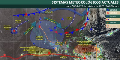 Oaxaca de Juárez, Oax. 20 de octubre de 2025.- La Coordinación Estatal de Protección Civil y Gestión de Riesgos (CEPCyGR) informa que se esperan lluvias con tormentas fuertes a localmente intensas en el norte del Istmo de Tehuantepec, Sierra de Juárez, Cuenca del Papaloapan, Sierra de Flores Magón y sectores de la Mixteca.