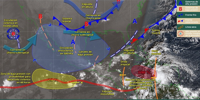 Por su parte, una vaguada en niveles medios y altos de la atmósfera ingresará al noroeste del país, en donde ocasionará vientos con rachas de hasta 50 km/h, así como descenso de temperaturas en Baja California.