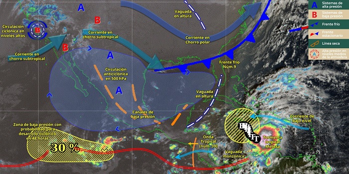 Una circulación anticiclónica en niveles medios de la atmósfera sobre la Mesa del Norte, ocasionará una baja probabilidad de lluvias en dicha región, además de la Mesa Central y el noreste del país. La zona de baja presión con probabilidad para desarrollo ciclónico sobre el océano Pacífico, continuará su desplazamiento hacia el oeste, alejándose gradualmente de costas mexicanas.