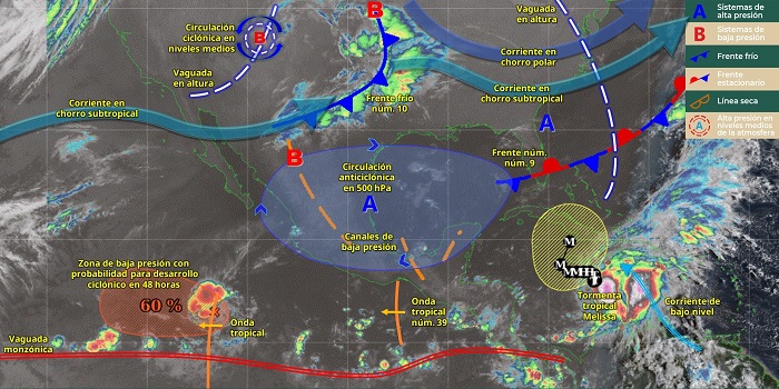 Un segundo canal de baja presión sobre el sureste de México y la península de Yucatán en interacción con el ingreso de humedad del golfo de México y mar Caribe, además de la onda tropical núm. 39 que se desplazará sobre el golfo de Tehuantepec, ocasionarán chubascos en Campeche (oeste) y Quintana Roo (sur), con lluvias puntuales fuertes en Oaxaca (este, suroeste y costa) y Chiapas (centro y sur). Finalmente, un anticiclón en niveles medios de la atmósfera mantendrá baja probabilidad de lluvia en la Mesa del Norte y la Mesa Central.
