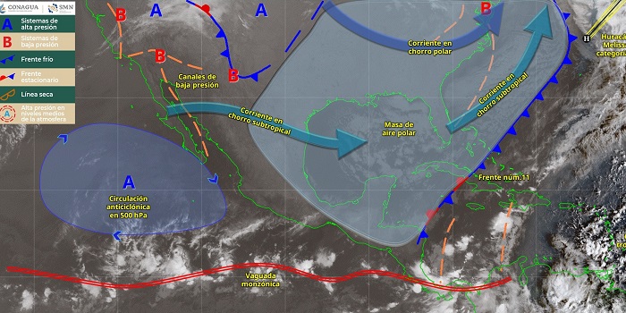 SMN/607|Ciudad de México a 31 de Octubre del 2025 06:00 hrs. Este día, la masa de aire polar que generó al frente núm. 11, modificará sus características térmicas al final del día, permitiendo un gradual ascenso de las temperaturas en gran parte del territorio nacional; sin embargo, continuará el ambiente frío a muy frío durante la mañana, con heladas en estados de la Mesa del Norte, la Mesa Central y el oriente del país; también, persistirá viento de componente norte con rachas de 55 a 70 km/h en Oaxaca (istmo y golfo de Tehuantepec), condición que disminuirá al final del día.