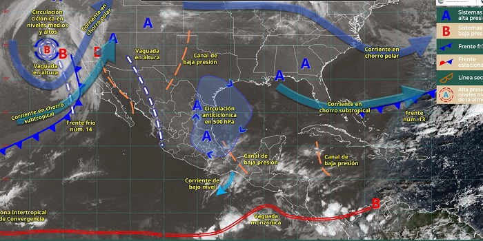 Por otro lado, una línea seca que se establecerá sobre el norte de Coahuila, propiciará rachas fuertes de viento en los estados del norte del territorio nacional. Canales de baja presión sobre el sureste de México y la península de Yucatán, en interacción con el ingreso de humedad del golfo de México y mar Caribe, originarán lluvias con chubascos en Oaxaca, Veracruz, Tabasco, Campeche y Yucatán, con lluvias puntuales fuertes en Chiapas (sur) y Quintana Roo (sur). Asimismo, el ingreso de humedad del océano Pacífico ocasionará lluvias aisladas en estados del norte, occidente y sur de México.