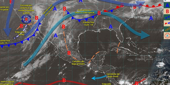El ingreso de aire húmedo proveniente del océano Pacífico, golfo de México y mar Caribe, en interacción con canales de baja presión en el interior del país, sureste mexicano y península de Yucatán, originarán lluvias puntuales fuertes en Guerrero (sur) y Chiapas (sur); chubascos en Quintana Roo, Yucatán, Campeche, Tabasco, Veracruz (regiones Papaloapan y Olmeca), Oaxaca, Michoacán, Colima, Jalisco y Nayarit; y lluvias aisladas en zonas de Puebla, Morelos, Ciudad de México, Estado de México, Hidalgo, Querétaro y Guanajuato. Finalmente, prevalecerá ambiente frío a muy frío sobre entidades de la Mesa del Norte y Mesa Central, con posibles heladas al amanecer, y ambiente gélido con temperaturas mínimas menores a -5°C y heladas en zonas serranas de Chihuahua y Durango.