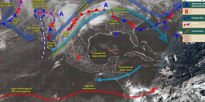 A su vez, persisten condiciones para caída de nieve o aguanieve en las sierras de Baja California, Sonora y Chihuahua. Por otra parte, canales de baja presión en el interior y el sureste del país, aunado al ingreso de humedad proveniente del océano Pacífico, golfo de México y mar Caribe, generarán lluvias y chubascos en el occidente, centro, oriente, sur y sureste de México, incluida la península de Yucatán.